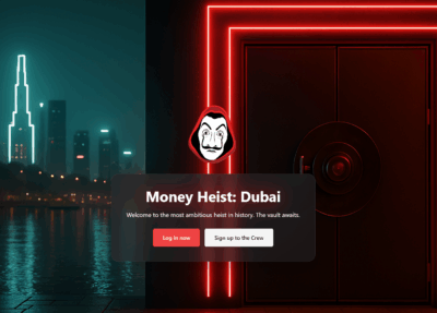 # This project is part of a cinematic Money Heist-themed escape room game set in Dubai, featuring immersive, responsive Sign In and Sign Up screens. In this immersive experience, participants must navigate complex security layers and solve realistic cyber challenges to succeed.